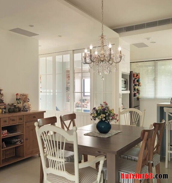 本套餐厅装饰中空间内的色彩搭配比较柔美,暖黄色的墙壁搭配上灯光的照射更是使空间充满了温馨的色彩,平顶式的石膏板吊顶上安装了一盏黑色的铁艺吊灯,在白色灯光的照射下黑色铁艺吊灯可以显得更加精美、别致。
