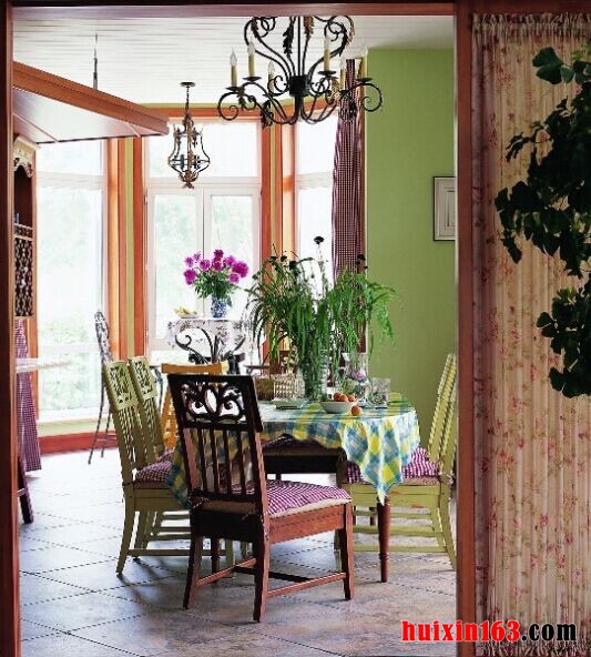 本套餐厅装饰中空间内的色彩搭配比较柔美,暖黄色的墙壁搭配上灯光的照射更是使空间充满了温馨的色彩,平顶式的石膏板吊顶上安装了一盏黑色的铁艺吊灯,在白色灯光的照射下黑色铁艺吊灯可以显得更加精美、别致。