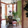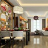 本套餐厅装饰中空间内的色彩搭配比较柔美,暖黄色的墙壁搭配上灯光的照射更是使空间充满了温馨的色彩,平顶式的石膏板吊顶上安装了一盏黑色的铁艺吊灯,在白色灯光的照射下黑色铁艺吊灯可以显得更加精美、别致。