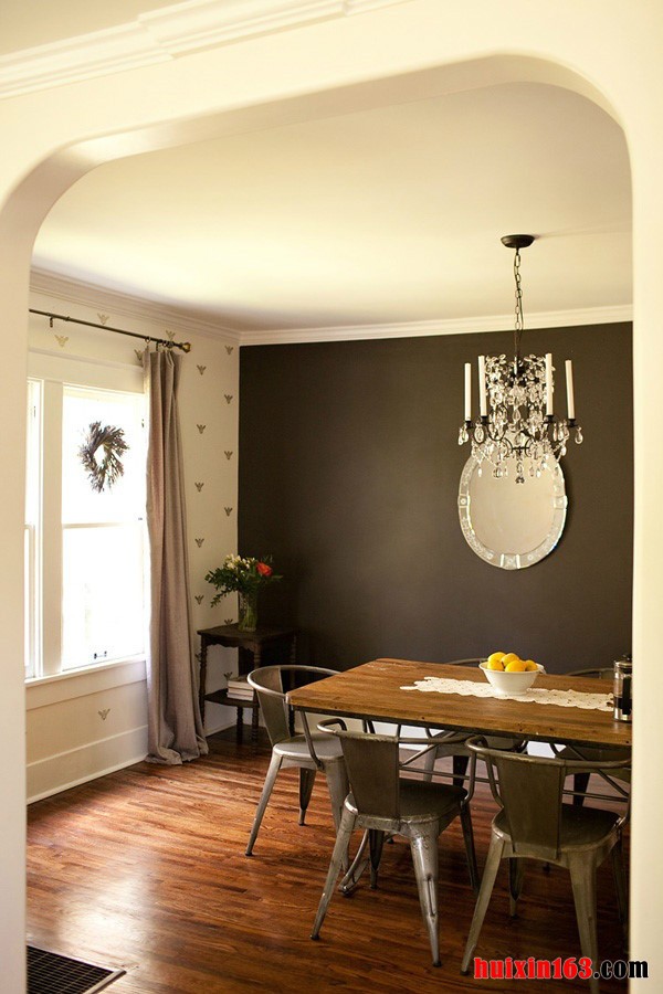本套餐厅装饰中空间内的色彩搭配比较柔美,暖黄色的墙壁搭配上灯光的照射更是使空间充满了温馨的色彩,平顶式的石膏板吊顶上安装了一盏黑色的铁艺吊灯,在白色灯光的照射下黑色铁艺吊灯可以显得更加精美、别致。