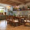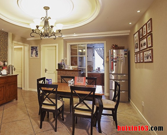 本套餐厅装饰中空间内的色彩搭配比较柔美,暖黄色的墙壁搭配上灯光的照射更是使空间充满了温馨的色彩,平顶式的石膏板吊顶上安装了一盏黑色的铁艺吊灯,在白色灯光的照射下黑色铁艺吊灯可以显得更加精美、别致。