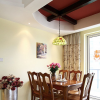 美式风格的家具在不同角度下会产生不同的光感,它并不是依靠金属材质与灯光搭配而达到的效果,而是通过它的雕刻花纹并不需要金属点缀便能达到此效果,可以使空间装饰显得更加自然,精致。 本套餐厅装饰中空间内的色彩搭配比较柔美,暖黄色的墙壁搭配上灯光的照射更是使空间充满了温馨的色彩,平顶式的石膏板吊顶上安装了一盏黑色的铁艺吊灯,在白色灯光的照射下黑色铁艺吊灯可以显得更加精美、别致。 更多»推荐家装效果图