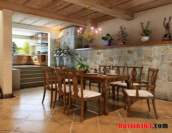 本套餐厅装饰中空间内的色彩搭配比较柔美,暖黄色的墙壁搭配上灯光的照射更是使空间充满了温馨的色彩,平顶式的石膏板吊顶上安装了一盏黑色的铁艺吊灯,在白色灯光的照射下黑色铁艺吊灯可以显得更加精美、别致。