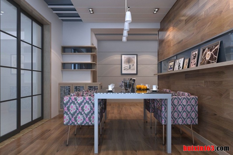 本套餐厅装饰中石膏板吊顶的设计采用了平顶式的设计,中间悬挂了一盏黑色的铁艺吊灯,精美别致的造型在白色的背景下显得更加独特,下方的实木餐桌也因此而显得更加就有古典气息。