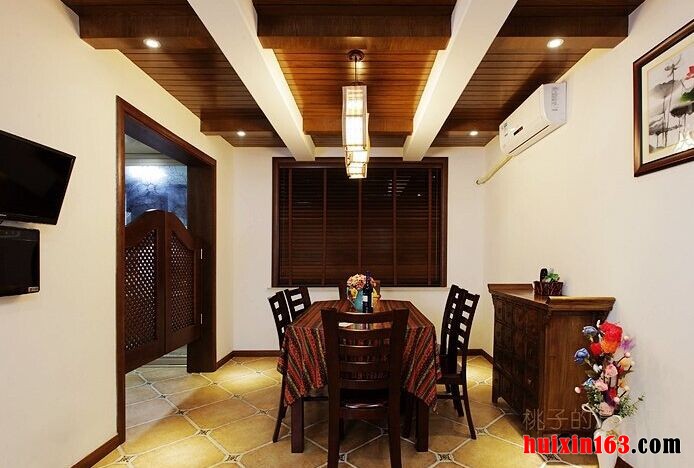 本套餐厅装饰中餐厅内部的整体家居搭配以及造型设计都比较具有自然气息,空间内的石膏板吊顶上添加了实木做造型可以将中间的白色水晶衬托的更加精美,富有华贵的气息,点缀空间装饰亮点。