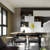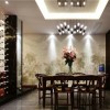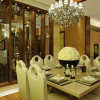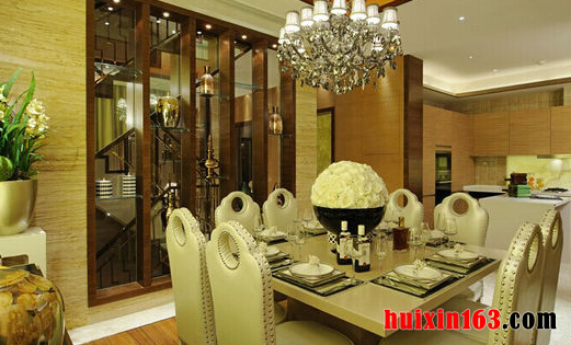 本套餐厅装饰的整体效果中带有一丝华丽的气息,空间内的石膏板吊顶中间安装了一盏华丽的水晶灯饰,将下方的白色餐桌衬托的更加别致,同时餐桌搭配的皮质座椅也凸显出了质感。