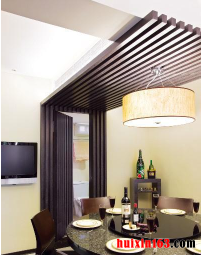 本套餐厅装饰的整体效果中带有一丝华丽的气息,空间内的石膏板吊顶中间安装了一盏华丽的水晶灯饰,将下方的白色餐桌衬托的更加别致,同时餐桌搭配的皮质座椅也凸显出了质感。