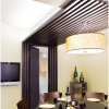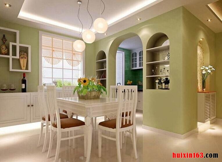 本套餐厅装饰的整体效果中带有一丝华丽的气息,空间内的石膏板吊顶中间安装了一盏华丽的水晶灯饰,将下方的白色餐桌衬托的更加别致,同时餐桌搭配的皮质座椅也凸显出了质感。