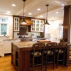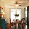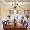 本套餐厅装饰中可以看出美式风格的装饰特点,空间内的装饰比较具有自有气息,无拘无束的设计可以将别致的设计感凸显出来,实木的餐桌框架上搭配了石材台面,更是可以将设计感凸显的淋漓尽致。