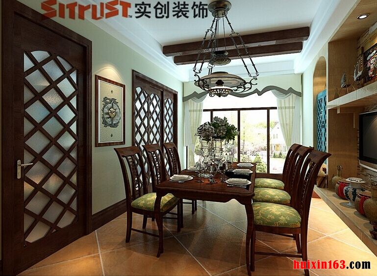 本套餐厅装饰中可以看出美式风格的装饰特点,空间内的装饰比较具有自有气息,无拘无束的设计可以将别致的设计感凸显出来,实木的餐桌框架上搭配了石材台面,更是可以将设计感凸显的淋漓尽致。