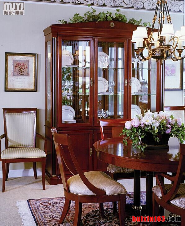 本套餐厅装饰中可以看出美式风格的装饰特点,空间内的装饰比较具有自有气息,无拘无束的设计可以将别致的设计感凸显出来,实木的餐桌框架上搭配了石材台面,更是可以将设计感凸显的淋漓尽致。