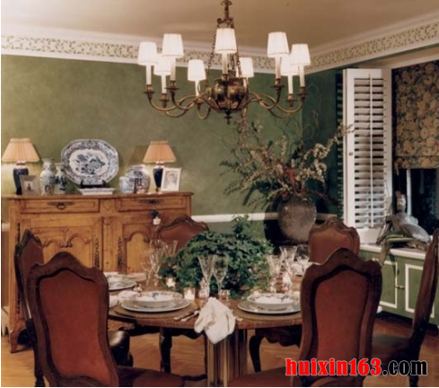本套餐厅装饰中可以看出美式风格的装饰特点,空间内的装饰比较具有自有气息,无拘无束的设计可以将别致的设计感凸显出来,实木的餐桌框架上搭配了石材台面,更是可以将设计感凸显的淋漓尽致。