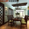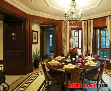 本套餐厅装饰中可以看出美式风格的装饰特点,空间内的装饰比较具有自有气息,无拘无束的设计可以将别致的设计感凸显出来,实木的餐桌框架上搭配了石材台面,更是可以将设计感凸显的淋漓尽致。