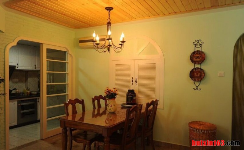 本套餐厅装饰中可以透露出一丝清新的味道,空间内的色彩搭配比较柔和,石膏板吊顶上的设计添加了实木做造型设计可以将中间的黑色铁艺吊灯衬托的更加别致,同时也凸显出了空间装饰的亮点。
