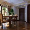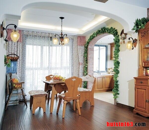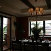 本套餐厅装饰中可以透露出一丝清新的味道,空间内的色彩搭配比较柔和,石膏板吊顶上的设计添加了实木做造型设计可以将中间的黑色铁艺吊灯衬托的更加别致,同时也凸显出了空间装饰的亮点。