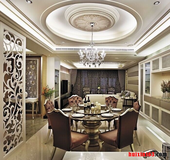 本套餐厅装饰中整体的搭配效果可以使空间充满华丽的气息,空间内的石膏板吊顶中间安装了一盏华美的水晶灯饰,精美的造型图案可以点缀整个空间,下方的实木餐桌上搭配了一款白色的蕾丝桌布,更为空间装饰增添了亮点。