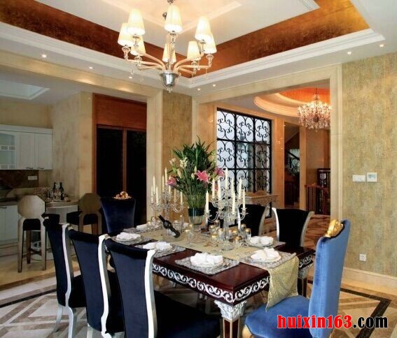 本套餐厅装饰中整体的搭配效果可以使空间充满华丽的气息,空间内的石膏板吊顶中间安装了一盏华美的水晶灯饰,精美的造型图案可以点缀整个空间,下方的实木餐桌上搭配了一款白色的蕾丝桌布,更为空间装饰增添了亮点。