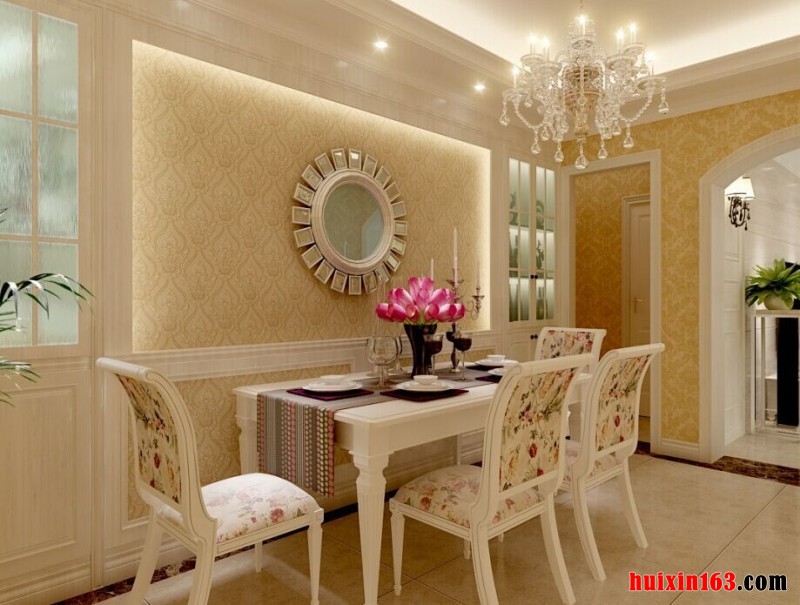 本套餐厅装饰中空间内的整体色调搭配主要是以白色为主,石膏板吊顶的设计采用了平顶式的造型,中间安装了一盏黑色的铁艺吊灯,精美的造型设计更是成为了空间装饰的一大亮点,为整个装饰增添了美感。