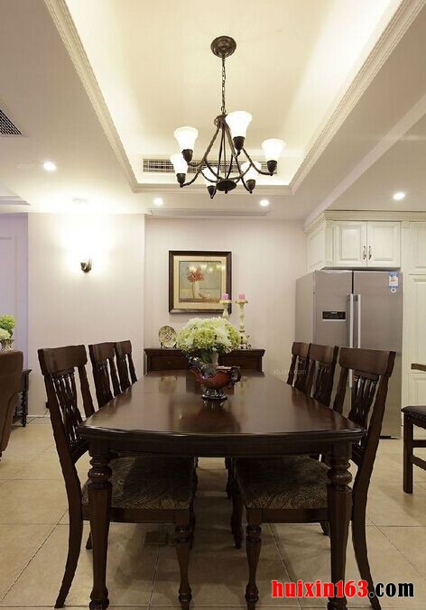 美式风格的设计可以带给人们一种自由、浪漫的感觉,但我们也可以在空间内部感受到文化气息,贵气加上大气的随意搭配可以使整个空间装饰都显得十分时尚,更是使空间充满了自由气息。 本套餐厅装饰中空间内的色调主要是以白色为主,平顶式的石膏板吊顶在四周做了夹层的设计并在中间安装了白色的灯带,可以将中间的黑色铁艺吊灯衬托的更加别致,也将下方的实木餐桌衬托的更加典雅、精美。 更多»推荐家装效果图