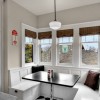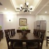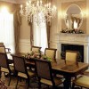 本套餐厅装饰中空间内的色调主要是以白色为主,平顶式的石膏板吊顶在四周做了夹层的设计并在中间安装了白色的灯带,可以将中间的黑色铁艺吊灯衬托的更加别致,也将下方的实木餐桌衬托的更加典雅、精美。