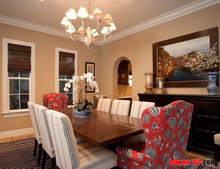本套餐厅装饰中空间内的色调主要是以白色为主,平顶式的石膏板吊顶在四周做了夹层的设计并在中间安装了白色的灯带,可以将中间的黑色铁艺吊灯衬托的更加别致,也将下方的实木餐桌衬托的更加典雅、精美。