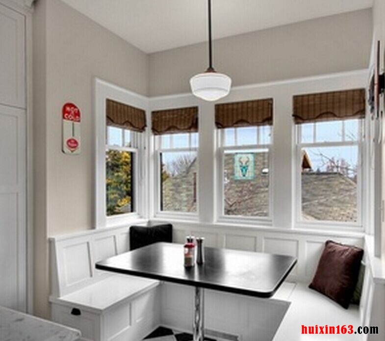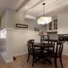 本套餐厅装饰中空间内的色调主要是以白色为主,平顶式的石膏板吊顶在四周做了夹层的设计并在中间安装了白色的灯带,可以将中间的黑色铁艺吊灯衬托的更加别致,也将下方的实木餐桌衬托的更加典雅、精美。