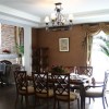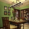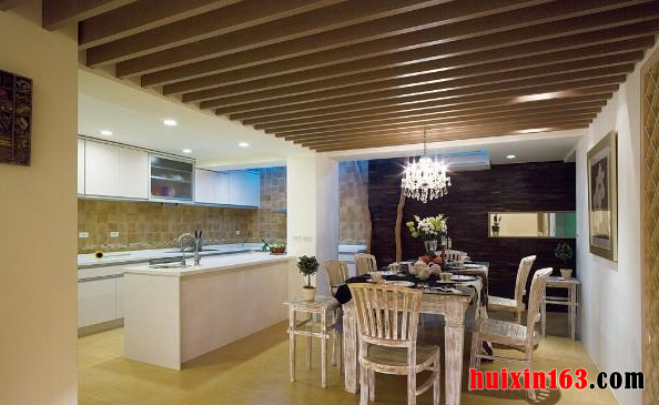 本套餐厅装饰中空间内的色调主要是以白色为主,平顶式的石膏板吊顶在四周做了夹层的设计并在中间安装了白色的灯带,可以将中间的黑色铁艺吊灯衬托的更加别致,也将下方的实木餐桌衬托的更加典雅、精美。