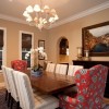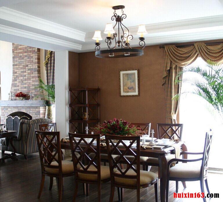 本套餐厅装饰中空间内的色调主要是以白色为主,平顶式的石膏板吊顶在四周做了夹层的设计并在中间安装了白色的灯带,可以将中间的黑色铁艺吊灯衬托的更加别致,也将下方的实木餐桌衬托的更加典雅、精美。