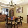 本套餐厅装饰中空间内的色调搭配主要是以白色及黄色为主,空间内的石膏板吊顶采用了凹槽式的设计,并在夹层中安装了一圈黄色的灯带,将中间的铁艺水晶吊灯衬托的更加精美,也彰显了一种别致。