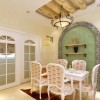 本套餐厅装饰中空间内的色调搭配主要是以白色及黄色为主,空间内的石膏板吊顶采用了凹槽式的设计,并在夹层中安装了一圈黄色的灯带,将中间的铁艺水晶吊灯衬托的更加精美,也彰显了一种别致。