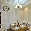 本套餐厅装饰中空间内的色调搭配主要是以白色及黄色为主,空间内的石膏板吊顶采用了凹槽式的设计,并在夹层中安装了一圈黄色的灯带,将中间的铁艺水晶吊灯衬托的更加精美,也彰显了一种别致。