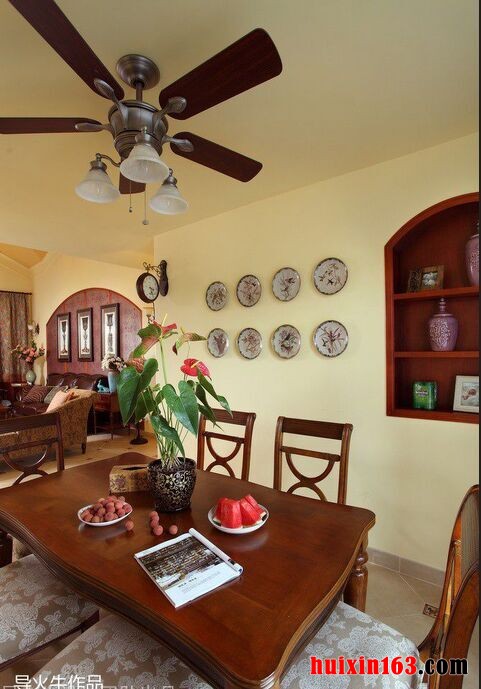 美式风格正式的整体效果可以带给人们一种清新感,这是其它装饰风格中所缺乏的特点,美式风格的设计中也会融入一些奢华的装饰设计,使整个空间营造出一个大气空间氛围。 本套餐厅装饰中空间内的主色调是以白色为主,空间内的石膏板吊顶中间做了简单的造型设计,并在中间安装了一盏黑色的铁艺吊灯,在白色背景的衬托下可以显得十分精美,也将下方的实木餐桌衬托的更加具有古典气息。 更多»推荐家装效果图