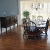 本套餐厅装饰中空间内的主色调是以白色为主,空间内的石膏板吊顶中间做了简单的造型设计,并在中间安装了一盏黑色的铁艺吊灯,在白色背景的衬托下可以显得十分精美,也将下方的实木餐桌衬托的更加具有古典气息。