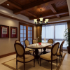 本套餐厅装饰中空间内的主色彩是以白色为主,石膏板吊顶的造型比较别致,可以将中间的水晶吊灯衬托的更加精美,也将造型彰显的更加别致,下方的黑色实木餐桌搭配上红色的布艺座椅,更加凸显了质感与时尚设计感。