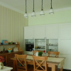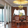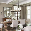 本套餐厅装饰中空间内的主色彩是以白色为主,石膏板吊顶的造型比较别致,可以将中间的水晶吊灯衬托的更加精美,也将造型彰显的更加别致,下方的黑色实木餐桌搭配上红色的布艺座椅,更加凸显了质感与时尚设计感。