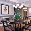 本套餐厅装饰中空间内的主色彩是以白色为主,石膏板吊顶的造型比较别致,可以将中间的水晶吊灯衬托的更加精美,也将造型彰显的更加别致,下方的黑色实木餐桌搭配上红色的布艺座椅,更加凸显了质感与时尚设计感。