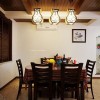 本套餐厅装饰中空间内的色调主要是以白色为主,平顶式的石膏板吊顶中间安装了一款黑色铁艺吊灯,圆形的造型设计,在平顶式吊顶的衬托下可以显得更加精美、别致,也将白色的皮质座椅衬托的更加华贵。
