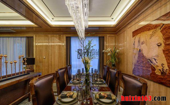 本套餐厅装饰中空间内的色调搭配比较柔和,同时也可以带给人们一种惊艳的感觉,一款实木材质的餐桌搭配上木质座椅可以彰显出一种时尚的设计感,同时也可以彰显出一种自然气息。