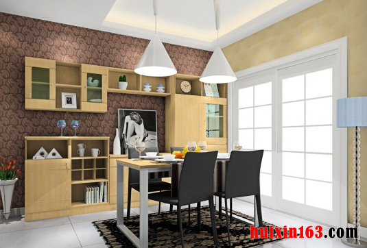 本套餐厅装饰中空间内的色调搭配比较柔和,同时也可以带给人们一种惊艳的感觉,一款实木材质的餐桌搭配上木质座椅可以彰显出一种时尚的设计感,同时也可以彰显出一种自然气息。