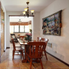 本套餐厅装饰中空间内的色调搭配比较柔和,石膏板吊顶采用了平顶式的设计,并将中间的黑色铁艺吊灯凸显的更加别致,实木材质的餐桌以及座椅也因此显得更加精致、典雅。