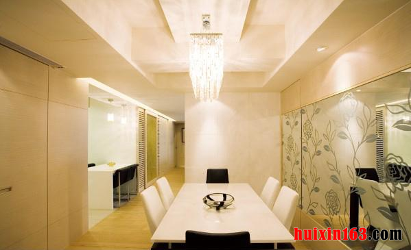 本套餐厅装饰中空间内的色调搭配比较柔和,石膏板吊顶采用了平顶式的设计,并将中间的黑色铁艺吊灯凸显的更加别致,实木材质的餐桌以及座椅也因此显得更加精致、典雅。