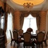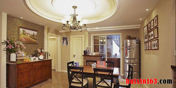 美式田园风格的装饰现下十分流行,素雅的色彩搭配上精致却小巧的家具,整体可以营造出一种大气的感觉,空间内在搭配上一些布艺装饰物品更是可以起到点缀的效果,为空间装饰增添美感。 本套餐厅装饰中空间内的色调搭配比较柔和,石膏板吊顶采用了平顶式的设计,并将中间的黑色铁艺吊灯凸显的更加别致,实木材质的餐桌以及座椅也因此显得更加精致、典雅。 更多»推荐家装效果图