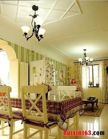 本套餐厅装饰中空间内的色调搭配比较柔和,石膏板吊顶采用了平顶式的设计,并将中间的黑色铁艺吊灯凸显的更加别致,实木材质的餐桌以及座椅也因此显得更加精致、典雅。