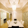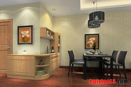 本套餐厅装饰中空间内的色调搭配比较柔和,石膏板吊顶采用了平顶式的设计,并将中间的黑色铁艺吊灯凸显的更加别致,实木材质的餐桌以及座椅也因此显得更加精致、典雅。