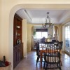 本套餐厅装饰中空间内的色调搭配比较柔和,石膏板吊顶采用了平顶式的设计,并将中间的黑色铁艺吊灯凸显的更加别致,实木材质的餐桌以及座椅也因此显得更加精致、典雅。
