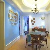 本套餐厅装饰中空间内的色调搭配比较柔和,石膏板吊顶采用了平顶式的设计,并将中间的黑色铁艺吊灯凸显的更加别致,实木材质的餐桌以及座椅也因此显得更加精致、典雅。
