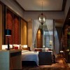 卧室主旨色彩:色彩应以统一、和谐、淡雅为宜,对局部的原色搭配应慎重,稳重的色调较受欢迎,本例主要运用到木材质,张显简朴大方之气。整个空间提取了传统古典家居韵味,又融入了现代生活符号,床上抱枕打破了空间的安静。充满中国韵味的剪纸使风格的体现的淋淋尽致。