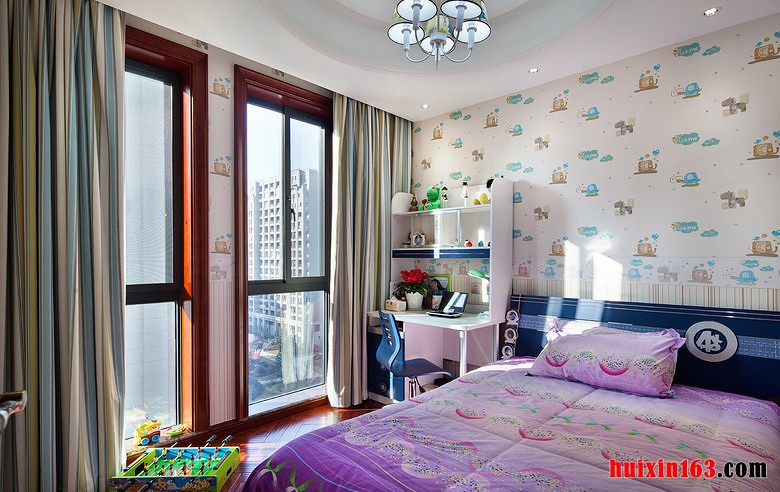 卧室规则整齐的吊顶处理,美丽简洁的白色的方格的窗子,最朴实的地方和房间里面的多种色彩和材质做好了完美的调和。地面上铺设上红色的实木的地板,深软包工艺电视背景墙和地面的颜色既有联系也有发展。给人创造了一个舒适的家。