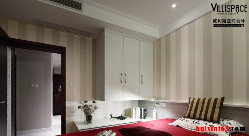 卧室规则整齐的吊顶处理,美丽简洁的白色的方格的窗子,最朴实的地方和房间里面的多种色彩和材质做好了完美的调和。地面上铺设上红色的实木的地板,深软包工艺电视背景墙和地面的颜色既有联系也有发展。给人创造了一个舒适的家。