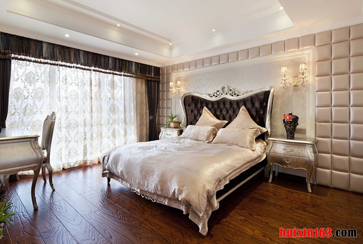 卧室家具的整体格调,极好地诠释出内敛不俗的品味。 主卧室把风格标志性纹样壁纸作为背景墙装饰,床和床头柜就要相对稳重一些,以此来互为补充,整个空间更加出彩。吊顶的装饰就是石膏板,在石膏板的上面吊了一个古典的灯,增加了房间内的高贵感。
